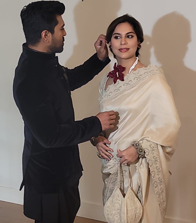 The video starts with a heartwarming snippet of Ram spraying hair spray on Upasana in her room, setting the tone for the rest of the video, which is filled with glimpses into their private lives. We get a tour of Ram’s hotel room, where he shows off his little religious set up, a testament to his strong faith and beliefs. As Ram gets ready and suits up, his charm and suaveness are on full display, making us fall in love with him even more. Meanwhile, Upasana is shown getting draped in her elegant saree and doing her hair and makeup. It is a sight one can not miss, when two come out of their respective rooms, looking red carpet ready. They bow down and seek blessings in front of their religious hotel room set up before they embark on creating history.
